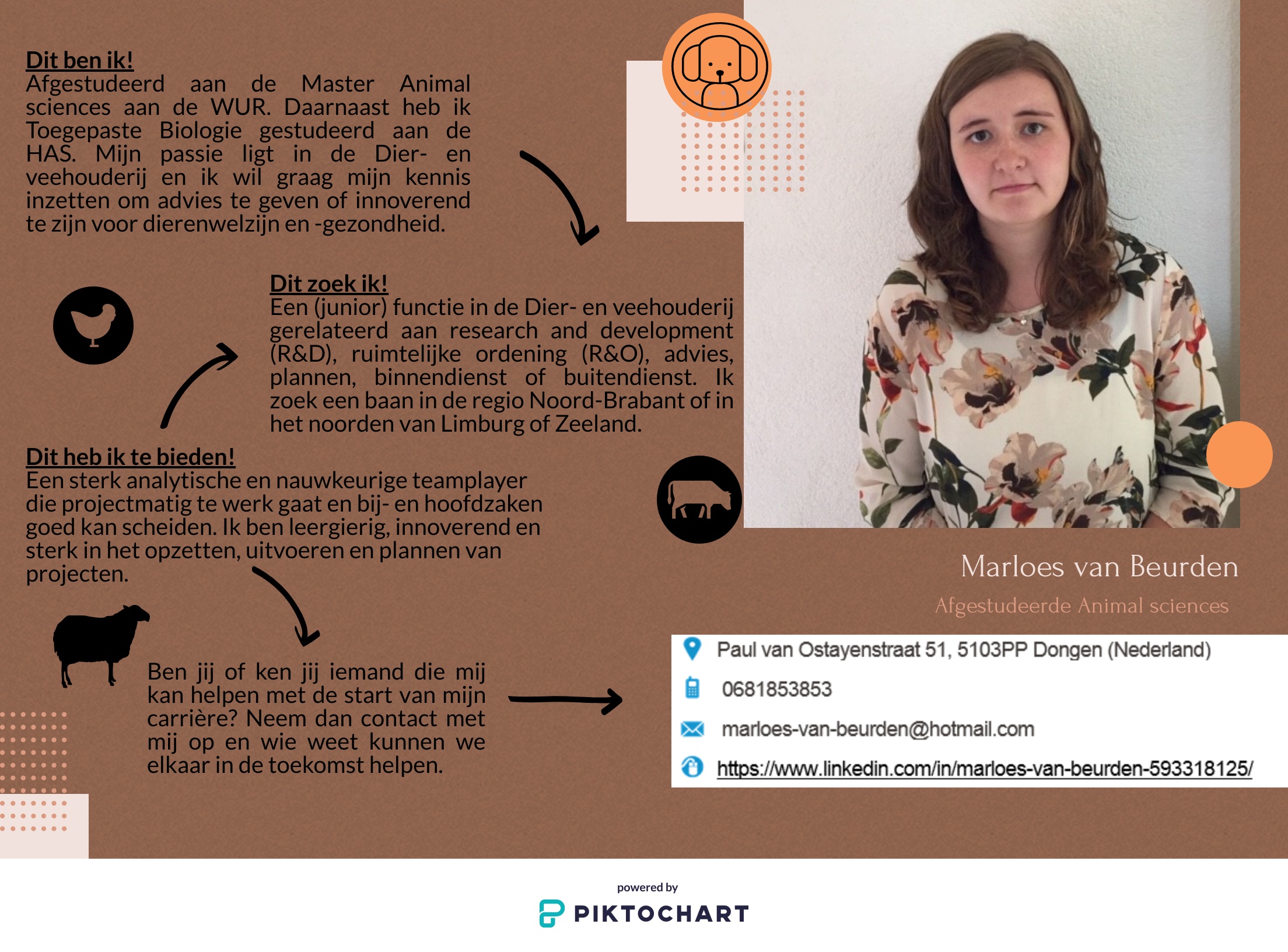 Als afgestudeerde Master of Animal Sciences is het mijn missie om te focussen op de verbetering van dierenwelzijn en dierengezondheid en hier advies over te geven. Tijdens mijn studies heb ik me bezig gehouden met het opzetten, uitvoeren en advies geven over projecten en stages gerelateerd aan welzijn en gezondheid van dierentuin-, proef- en huisdieren. Mijn kracht ligt in het analyseren van data en informatie en het uitgeven van een passend advies. Nu ben ik opzoek naar een baan met een leuk team waarin ik mijn communicatieve en analytische skills kan tonen!
