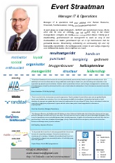 • Evert is een man met energie, durf, enthousiasme maar bovenal heeft hij passie om zaken goed te regelen en te organiseren. Zijn ICT kennis, in brede zin, is sterk maar ook op het gebied van HR, Financien, processen en (People) Management is hij zeer bedreven. Wilt u uw bedrijf een impuls geven in effectiviteit en efficiency dan is Evert Straatman de man.